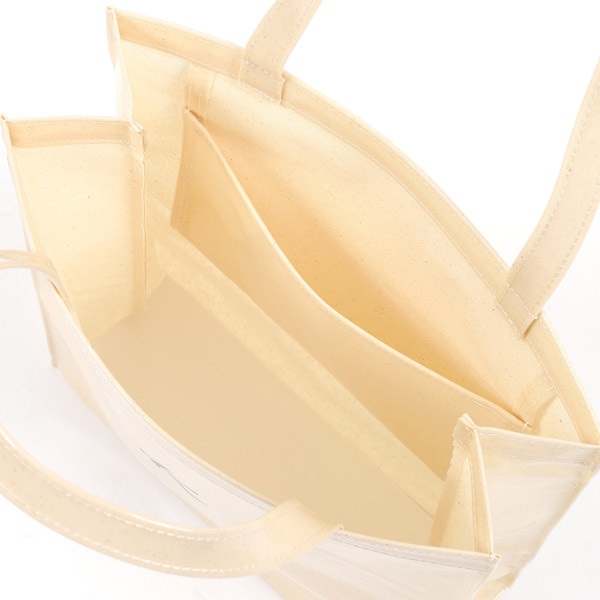 シンプルなデザインと使い勝手の良さで人気のショッピングバッグ。A4バインダーがぴったり入るサイズです。すっきりと持てる縦長タイプで、サブバッグやランチバッグにぴったり。ビニール素材なので、水滴や軽い汚れの拭き取りができ便利です。