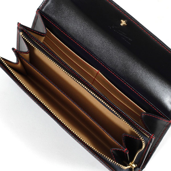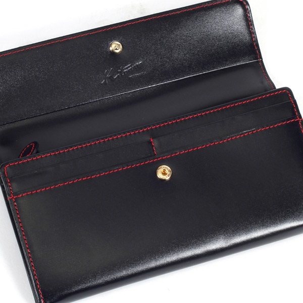 上品なツヤ感のあるスムース牛革を使用した長財布。発色が美しい本体カラーと抜きのKマークとのカラーコンビがアクセントになっています。収納力のある小銭入れや便利な背面ポケットなど、使いやすさにもこだわりました。