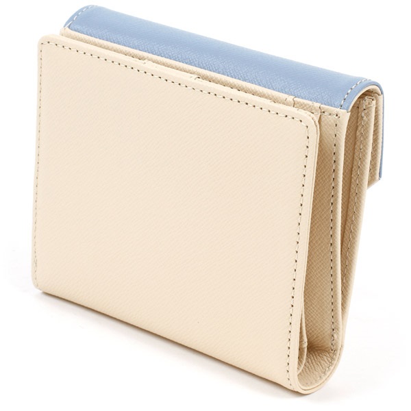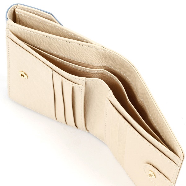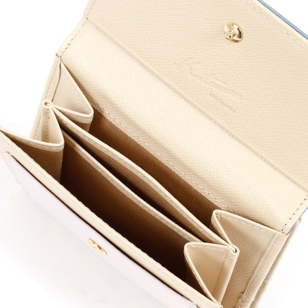 3色のマルチカラーがポイントの二折財布。かぶせに箔押しのKITAMURAロゴをあしらいました。マチがスリムで持ち歩きしやすいコンパクトなつくりです。小銭入れ部分には定期券など使用頻度の高いカードを入れるのに便利なカードポケット付き。素材にはキズが目立ちにくい型押しの牛革を使用しています。