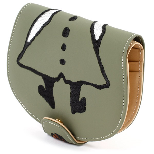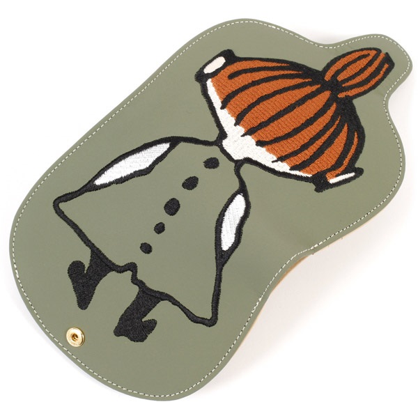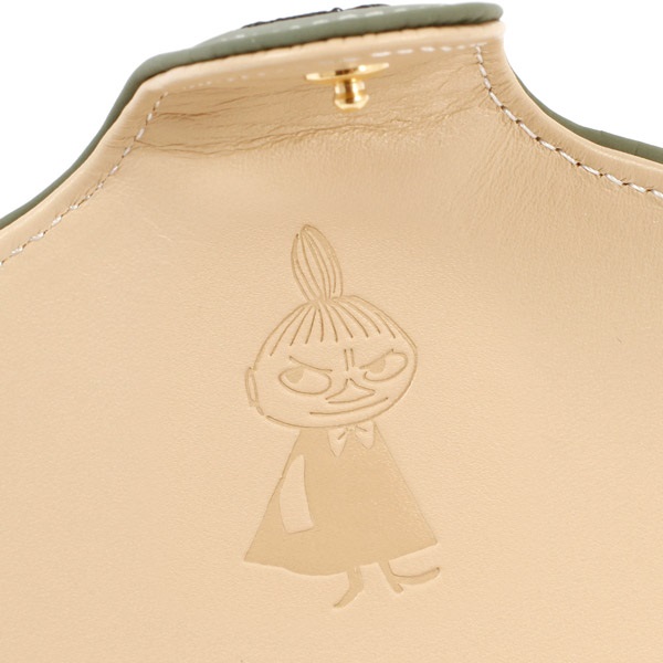 リトルミイの後ろ姿を刺繍で大胆にあしらった二折財布。特徴的なタマネギ型のおだんご頭を、お財布のホック部分のシルエットに見立てました。まるでリトルミイがでんぐり返ししているようなユーモアのあるデザイン。小銭入れは立体的に開くボックスタイプで機能的です。内装にはリトルミイの全身像を素押しであしらいました。