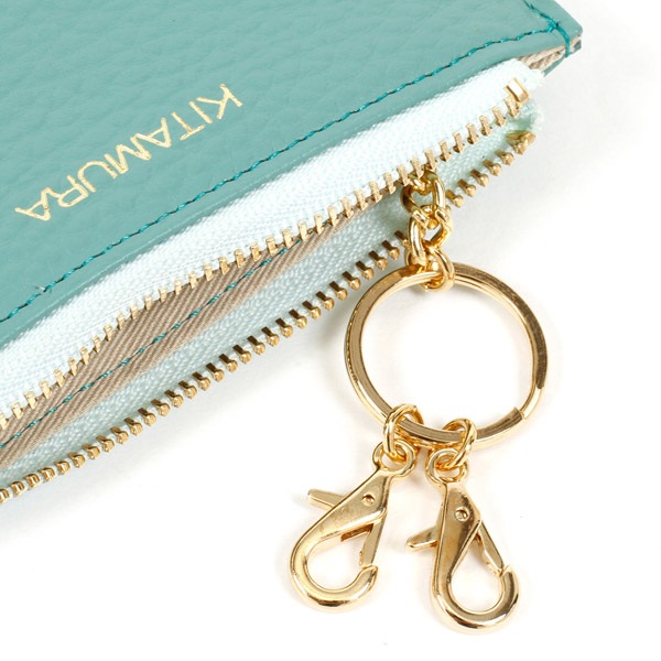 本体とファスナーテープのカラーコンビがポイントのフラグメントケース。カラーコンビが映えるシンプルなデザインで、前面には箔押しのKITAMURAロゴをあしらいました。内装にキーフック、側面にカード段が付いており、キーケースやパスケース、お札を折って入れれば小さなお財布としてもお使いいただけるマルチアイテムです。