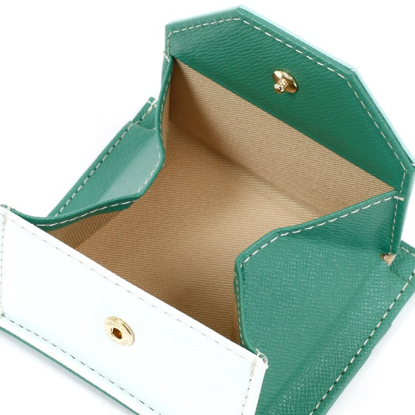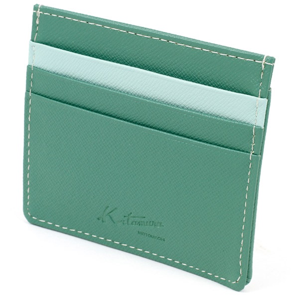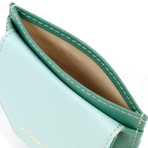 3色のマルチカラーがポイントの小銭入れ。かぶせに箔押しのKITAMURAロゴをあしらいました。お札を半分に畳めば中央のポケットに収納でき、コンパクトなお財布としてもおすすめ。素材にはキズが目立ちにくい型押しの牛革を使用しています。