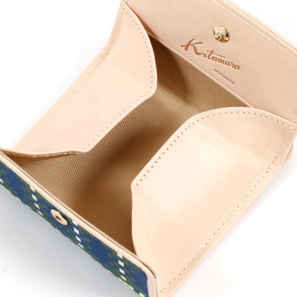 細やかなメッシュ風プリントのキャンバス生地を使用した小銭入れ。縁取りや内装にはヌメ革を使用しており、使うほどに色の深みが増していく経年変化が楽しめます。お札を半分に折りたためば中央のポケットに収納可能。カードポケットも付いており、ミニサイズのお財布としてもおすすめです。