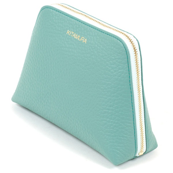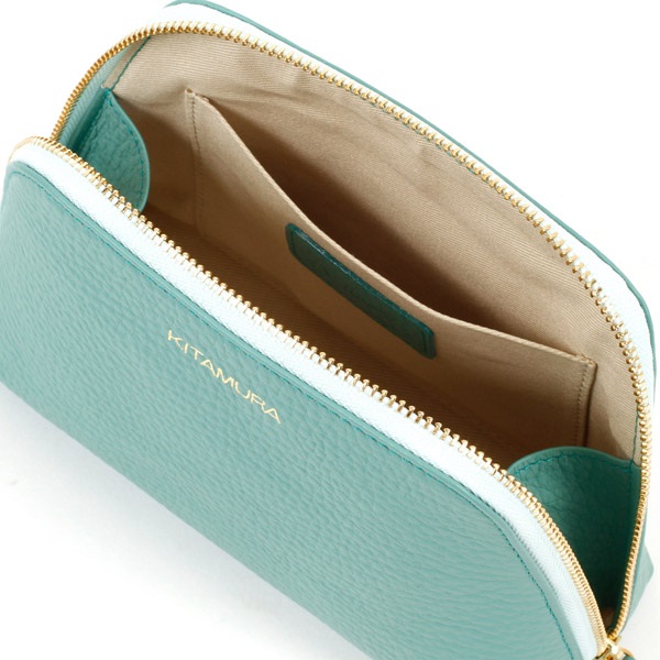 本体とファスナーテープのカラーコンビがポイントの牛革ポーチ。カラーコンビが映えるシンプルなデザインで、前面には箔押しのKITAMURAロゴをあしらいました。やや大きめのサイズ感で、内側には便利な内ポケット付き。