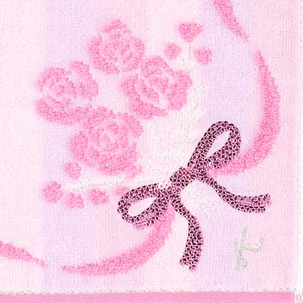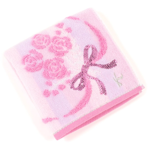 ギフトにおすすめのBOX入りタオルハンカチ。ニュアンスカラーのストライプ柄に、バラの花束とリボンモチーフが華やかで可愛らしいデザインです。花束のリボンにはスパンコールをあしらいました。BOXにはリボン掛けしたようなプリントを施し、特別感をプラス。Kマークのシルバー箔押しがワンポイントになっています。