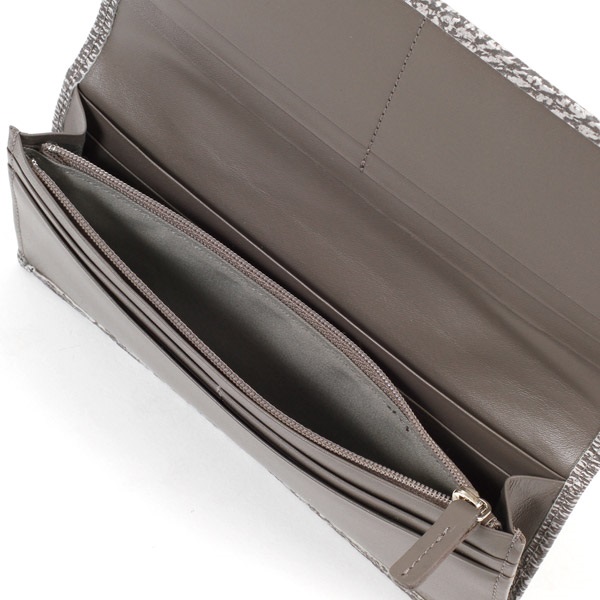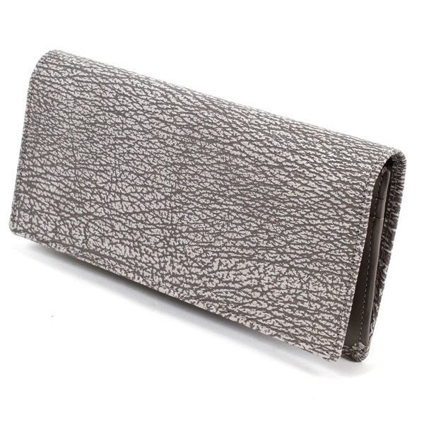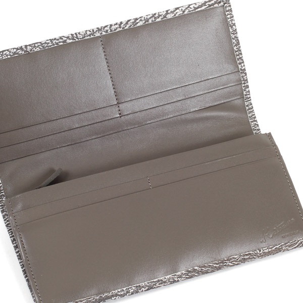 独特の水シボ模様が美しいシャークレザーを贅沢に使用した長財布。使い込むほど自然な光沢が増し、手に馴染んで個性的な風合いが生まれます。筋繊維が密集しているため耐久性が高く、キズが目立ちにくいのも特長です。カード段や内ポケットなど収納スペースも充実。内装はシンプルなスムース牛革を使用しています。