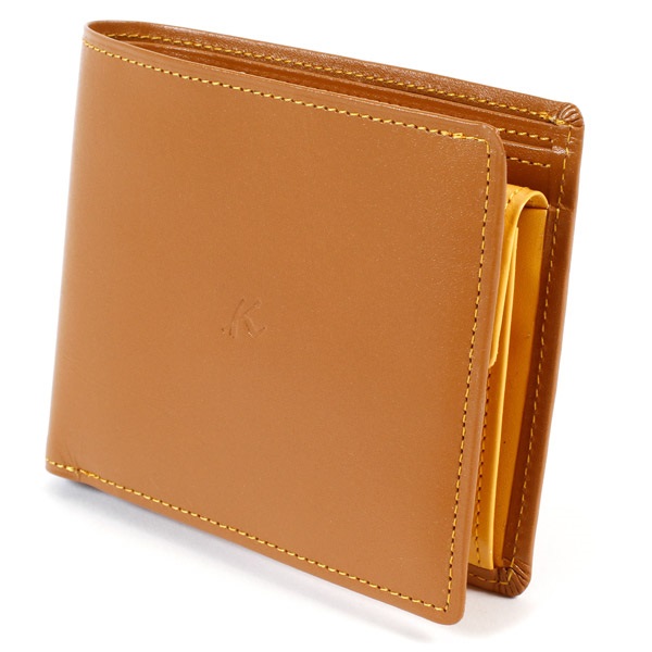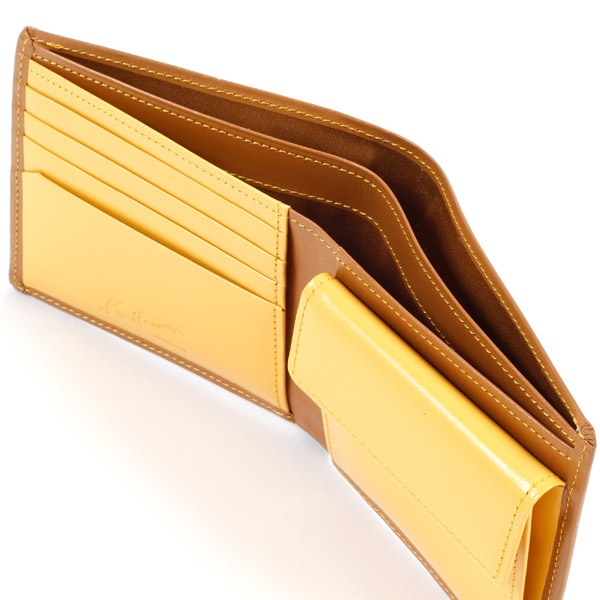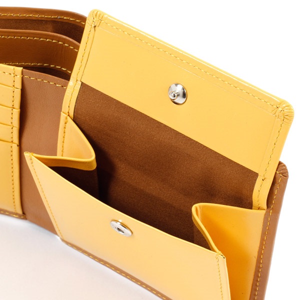 ツヤのあるスムース牛革でお作りした、シンプルな二折財布。手触りが良く、しっとりとした質感が特徴です。カード段と小銭入れの遊び心ある配色がさりげないオシャレ感をプラス。小銭入れは使いやすいかぶせタイプです。