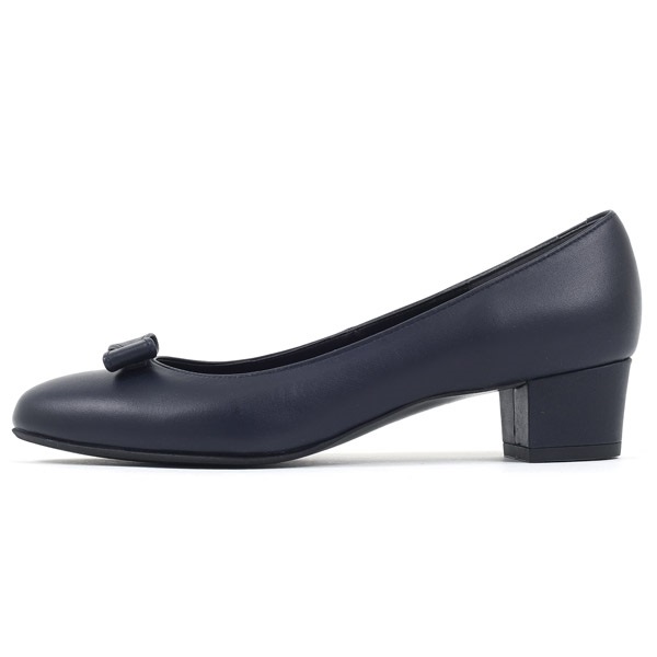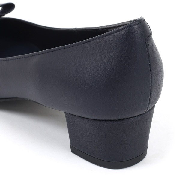 撥水機能を兼ね備えたシンプルな牛革ローヒールパンプス。立体的なプチリボンが上品な可愛らしさをプラスします。3.5cmのスクエア型ヒールで安定感のある履き心地。足裏の当たりがよいクッション入りの中敷きを使用しています。濃色の中敷きは、靴を脱ぐシーンで汚れが気にならないのもポイント。オケージョンシーンにもおすすめの一足です。