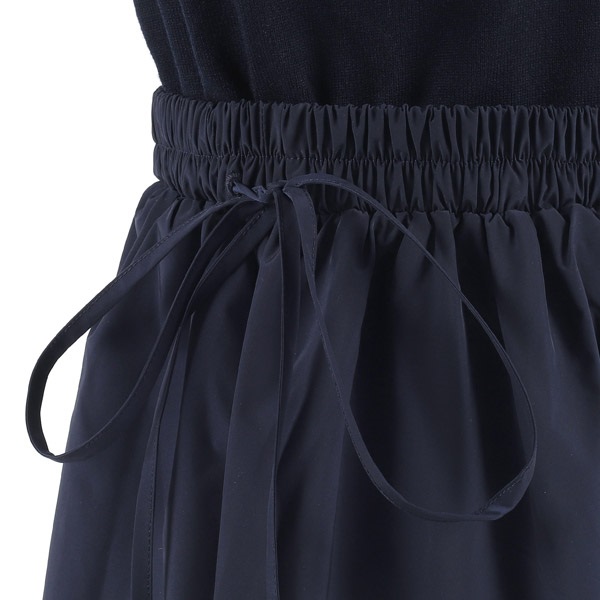 ウエスト部分にたっぷり入ったギャザーがポイントのニットドッキングワンピース。ウエストはゴム仕様で、リラックス感のある着心地です。さらに、両サイドのリボンでウエストを絞り、シルエットを調節することもできます。膝が隠れるミディ丈で、ニット部分はカジュアルになりすぎないよう、程よくフィットするサイズ感に仕上げました。背中側の首元にあしらったKITAMURAロゴプレートがきらりと光るワンポイントに。一枚で異素材を組み合わせたメリハリのある着こなしが楽しめます。