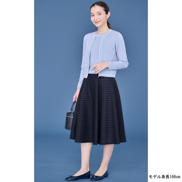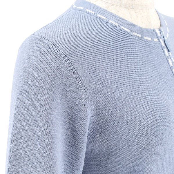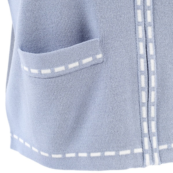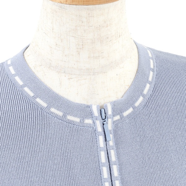 首元や裾、袖口などに施したステッチ風デザインがポイントのニットカーディガン。着回ししやすいシンプルなデザインに、配色のステッチデザインがアクセントになっています。ジップアップデザインで程よいカジュアル感ありながら、上品な印象に仕上げました。ショート丈のコンパクトなシルエットで、羽織としてはもちろん、一枚での着用もおすすめ。配色プルオーバー(KH0841)とのアンサンブルでの着用も可能です。