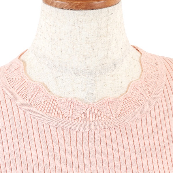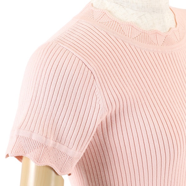 首回りと袖口にあしらったレース風編地がポイントの半袖ニット。リブ編みで伸縮性があり、程よいフィット感で身体のラインを拾いすぎず、すっきりと見せてくれます。Tシャツ感覚で着用できるシンプルなデザインで、きれいめからカジュアルまで、幅広いコーディネートで活躍します。長袖ボレロニット(KH0843)とのアンサンブルもおすすめです。