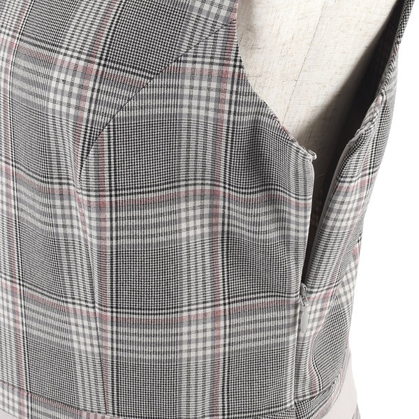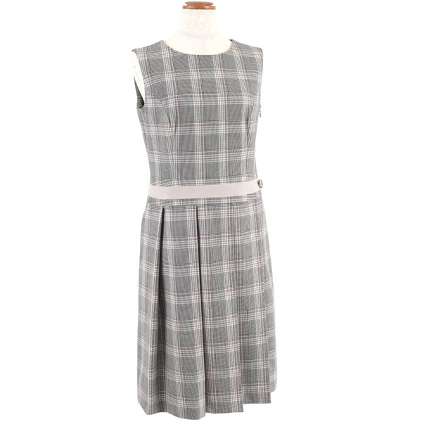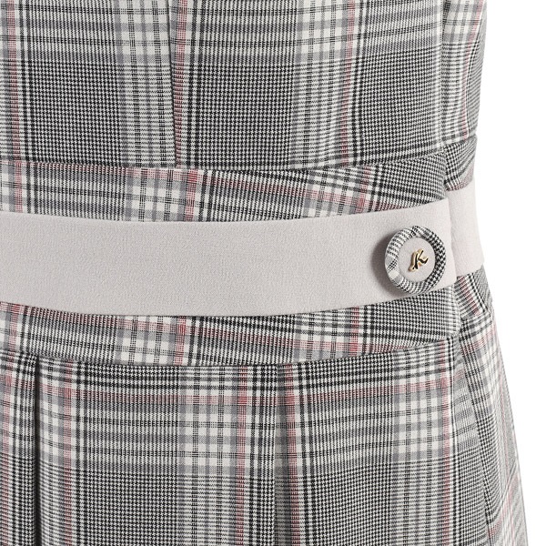 グレンチェック柄のジャンパースカート。プリーツできちんと感をプラスし、トラッドな印象に仕上げました。ウエストベルトの無地の別布がシルエットにメリハリをプラス。Kマークの金具付きボタンがワンポイントです。後ろ側は背中をすっきりと見せてくれるV開きデザインで、バックスタイルにもこだわりました。肌寒い時期にはニットやカーディガンとのレイヤードスタイル、1枚でノースリーブワンピースとしても着用でき、シーズンレスで着回しできるのも嬉しいポイントです。