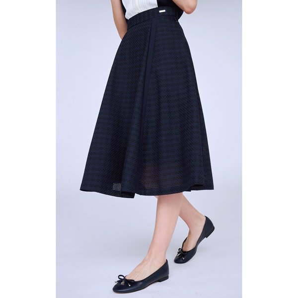 シルエットの美しさにこだわったフレアスカート。チェック柄レース素材をふんだんに使用し、ボリューム感のある華やかな印象に仕上げました。フレア部分にさり気なく入った別布の縦ラインが、動いたときに表情をプラスします。ウエストベルトにはKITAMURAロゴが刻印されたチャームをワンポイントにあしらいました。膝が隠れる上品な丈感で、オンオフ幅広いシーンでお使いいただけます。片側にポケット付きなのも嬉しいポイントです。