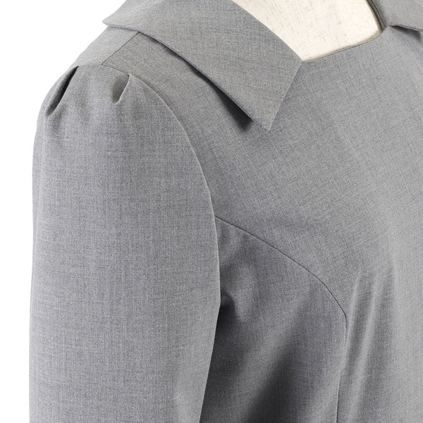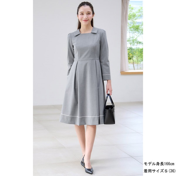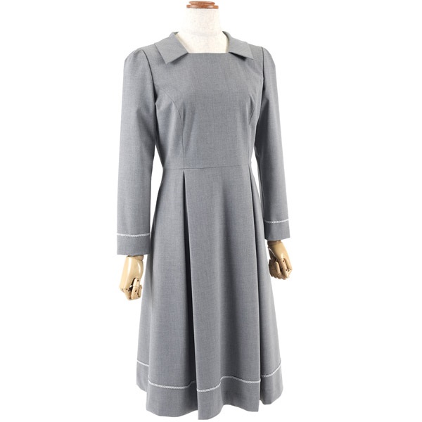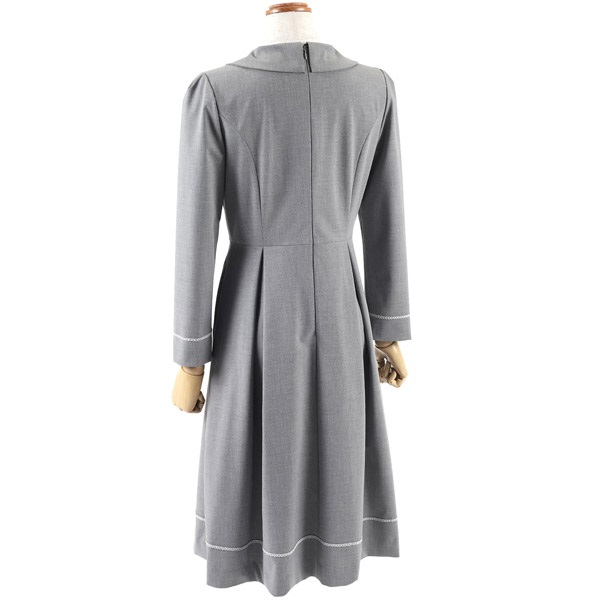 袖口と裾にあしらったコードレースがポイントの襟付き長袖ワンピース。きちんと感を演出してくれる襟付きデザインに、スクエアネックで程よい抜け感をプラスしました。肩にはさり気なくタックを入れ、キタムラらしい可愛らしさをプラス。膝が隠れる上品な丈感で、高めのウエスト切り替えはスタイルアップ効果も。ポケット付きなのも嬉しいポイント。1枚でロングシーズン着用していただけます。