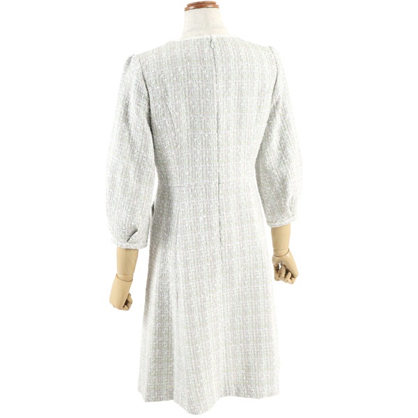 着るだけで華やかさを演出してくれるファンシーツイードの七分丈ワンピース。首元とポケットにあしらったブレードのテープがさり気ないアクセントになっています。首元のカットデザインが抜け感をプラス。袖はボリュームのあるパフスリーブで可愛らしい印象に仕上げました。ややゆったりとしたAラインシルエットですが、スタイルアップして見えるよう、高めのウエスト切り替え位置と、短すぎないミニ丈のバランスにこだわりました。ポケット付きも嬉しいポイント。普段使いはもちろん、オケージョンシーンにもおすすめです。