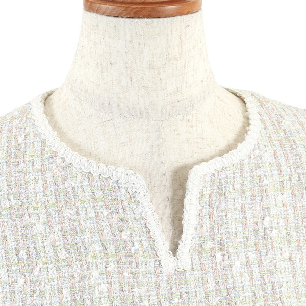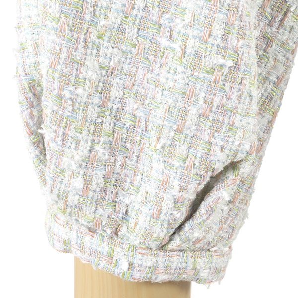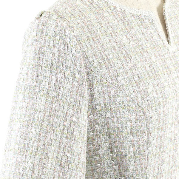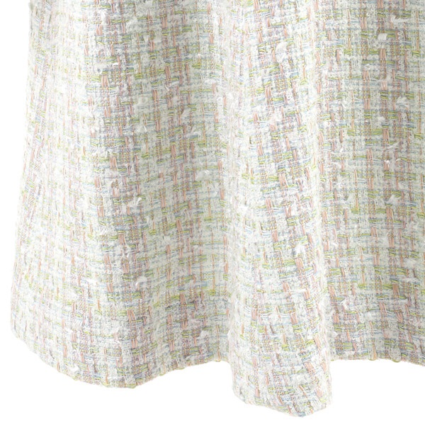 色とりどりの意匠糸を複雑に織り交ぜた、華やかで立体感のある素材。やわらかく、軽やかな印象です。