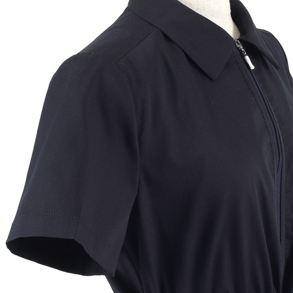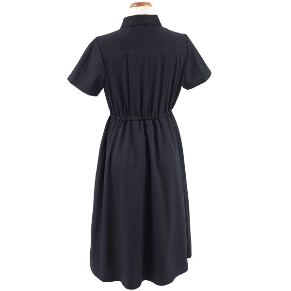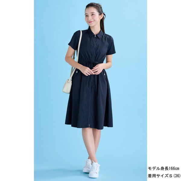 雨の日のお出かけにおすすめの、撥水素材を使用した半袖ワンピース。襟付きデザインにフロントファスナー仕様で、カジュアルな印象に仕上げました。フロントファスナーの両サイドには同色のグログランテープをあしらい、さり気ないアクセントに。また、ファスナーの引手とフラップポケットのボタンにホワイトカラーを使用して、ディテールにもこだわりました。ウエストはギャザーデザインのゴム仕様で自然なブラウジングができ、細めのリボンで絞りを調整も可能。スカートは膝丈の広がりすぎないシルエットで、軽やかに着用していただけます。