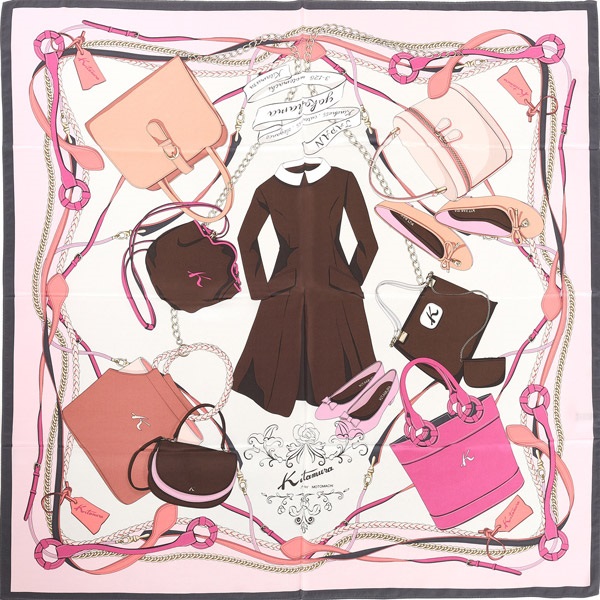 バッグやワンピース、シューズなどキタムラアイテムが大胆にプリントされた大判スカーフ。シルク100%で、上品なツヤが華やか。首や肩に巻くスタイリングはもちろん、バッグの持ち手に巻いたり結んだりするのもおすすめです。