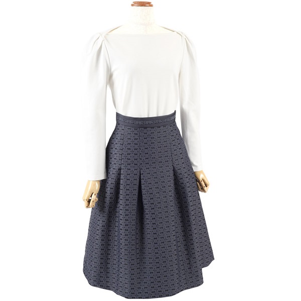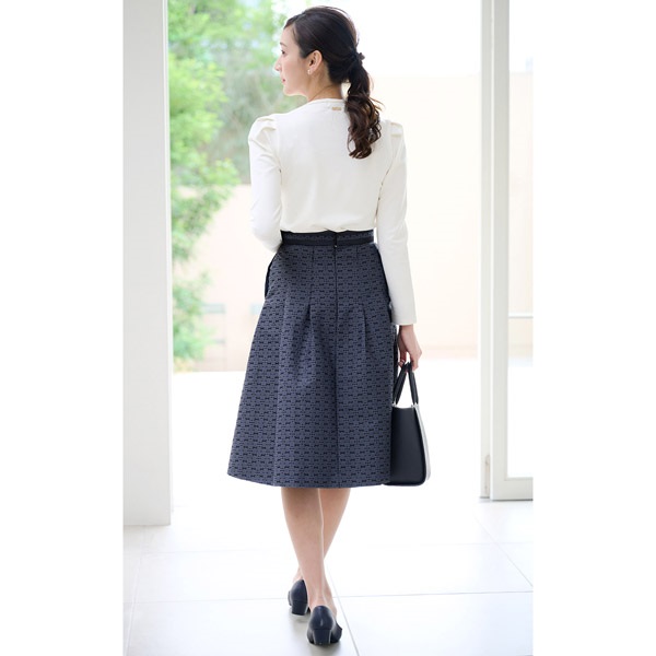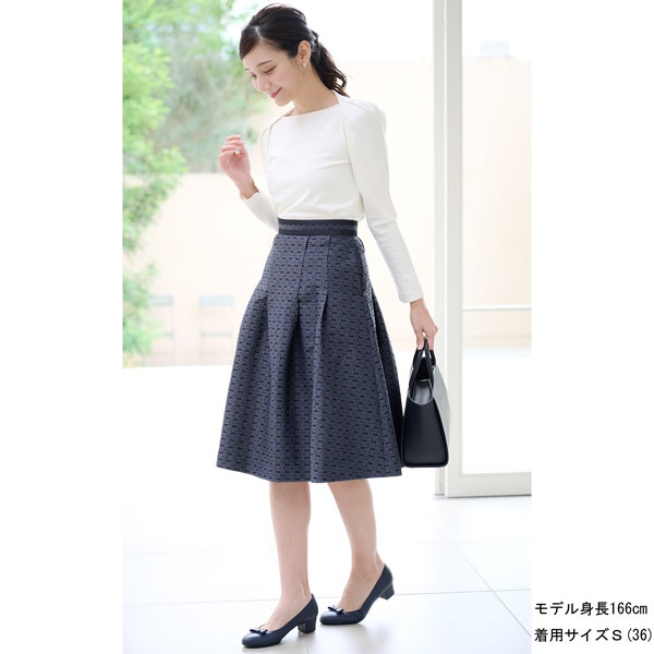 バッグのモチーフをお花に見立てたオリジナル素材がポイントのタックスカート。腰回りはすっきりと、裾にかけて立体感のあるシルエットに仕上げました。ウエストベルトにあしらった無地の別布がさり気ないアクセントになっています。軽量でシワになりにくく、お手入れしやすいのもポイント。膝が隠れる上品な丈感で、オケージョンやビジネス、デイリーまで幅広くお使いいただけます。同素材のスカート(KH0824)とのセットアップもおすすめです。
