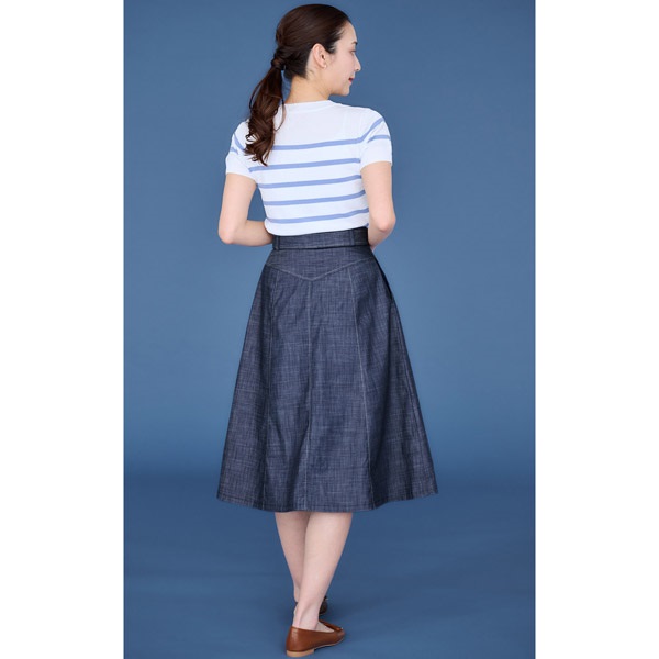 デニム調生地を使用したシンプルなAラインスカート。縦に入った切り替えと配色ステッチで立体感をプラスし、シンプルながら表情のあるデザインに仕上げました。ステッチがAラインシルエットを際立たせ、美しく見せてくれます。ウエストベルトは取り外しでき、お好みでアレンジしていただけます。両サイドにポケットが付いているのも嬉しいポイント。ラフな魅力と上品さを兼ね備えた一枚です。