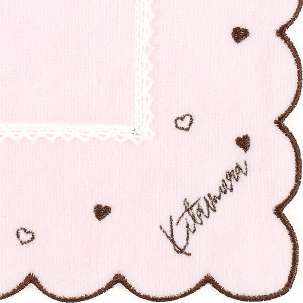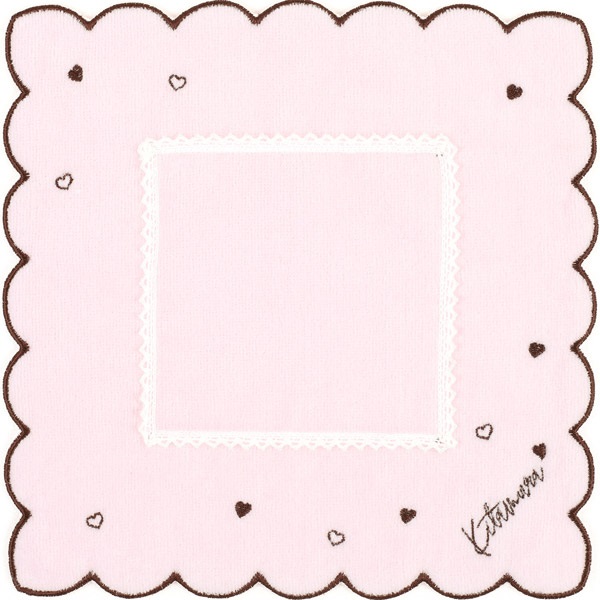 ハート刺繍をちりばめたスカラップカットのタオルハンカチ。中央にはレースをあしらい、可愛らしさをプラスしました。右下に手書き風キタムラロゴ刺繍が入っています。