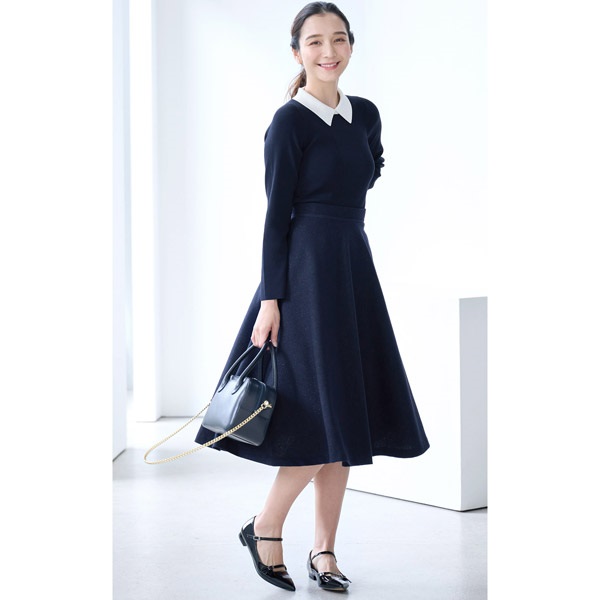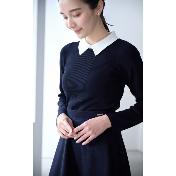 シンプルな襟付きニット。前身頃にさり気なく入ったリブ編みのラインがポイントです。身体にフィットするシルエットで、ボトムスにインする際も、すっきりと着用できます。きちんと感のある上品な印象で、デイリーからビジネスまで幅広いシーンにおすすめ。ダークブルーとホワイトは襟が配色になっています。