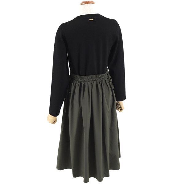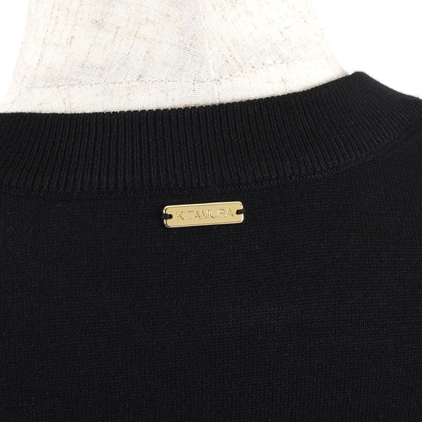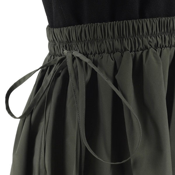 ウエスト部分にたっぷり入ったギャザーがポイントのニットドッキングワンピース。ウエストはゴム仕様で、リラックス感のある着心地です。さらに、両サイドのリボンでウエストを絞り、シルエットを調節することもできます。膝が隠れるミディ丈で、ニット部分はカジュアルになりすぎないよう、程よくフィットするサイズ感に仕上げました。背中側の首元にあしらったKITAMURAロゴプレートがきらりと光るワンポイントに。一枚で異素材を組み合わせたメリハリのある着こなしが楽しめます。