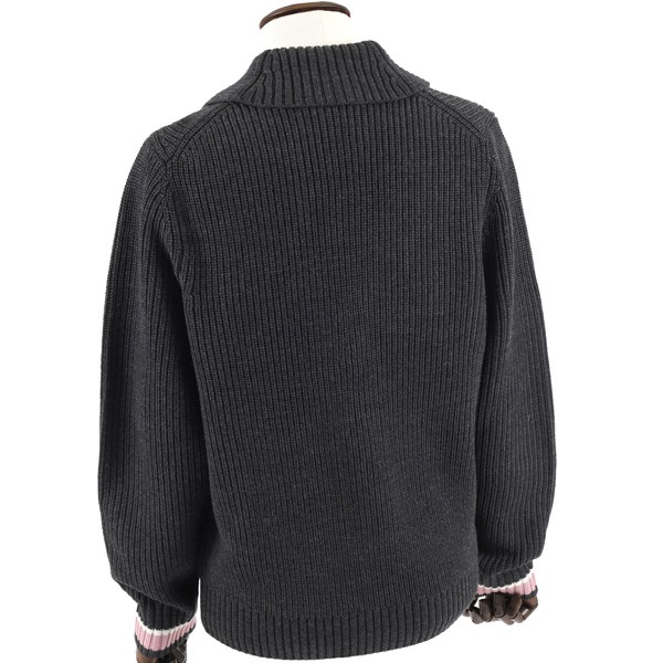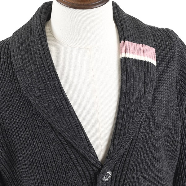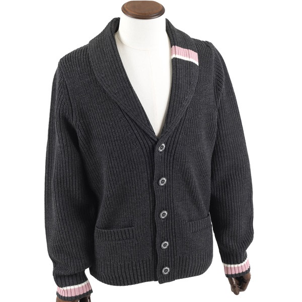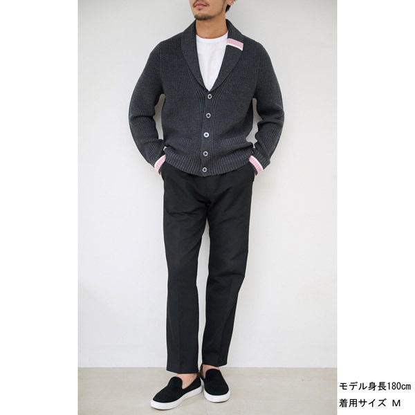 オーセンティックなデザインのショールカラーカーディガン。上質なメリノウールをふんだんに使用した、畔編みで仕上げました。シンプルなデザインに、襟と袖口のラインがアクセントになっています。ボリュームがあり、アウターのように羽織ることもできます。