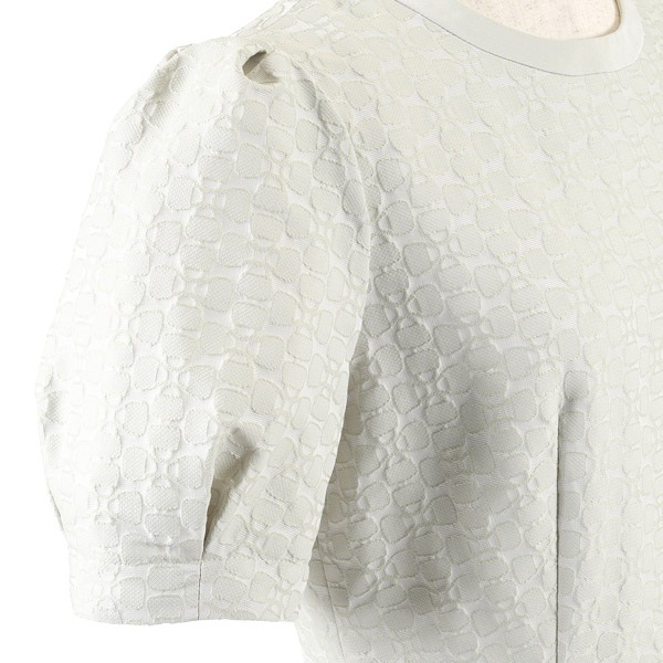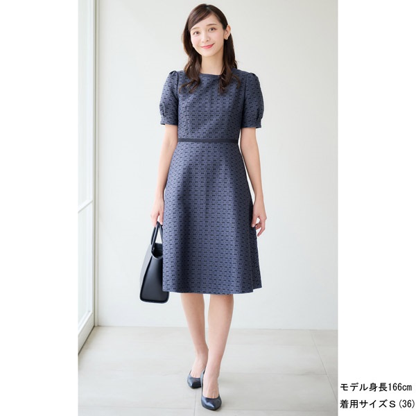 バッグのモチーフをお花に見立てたオリジナル素材がポイントの半袖ワンピース。生地感をいかしたシンプルなフォルムに、パフスリーブやフレアシルエットで可愛らしさをプラス。首元とウエスト部分にあしらった無地の別布でメリハリのあるデザインに仕上げました。高めのウエスト切り替えで、スタイルアップ効果も。スカートは膝が隠れる長さで、ローヒールでもバランス良く着こなせます。ポケット付きで実用性も兼ね備えています。