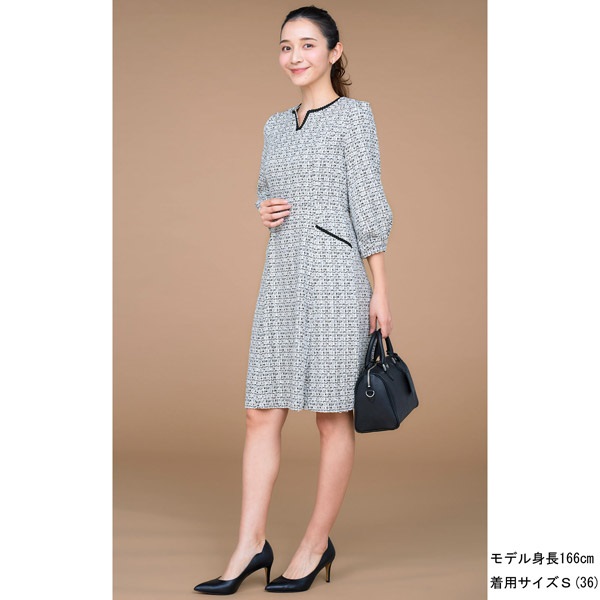 着るだけで華やかさを演出してくれるファンシーツイードの七分丈ワンピース。首元とポケットにあしらったブレードのテープがさり気ないアクセントになっています。首元のカットデザインが抜け感をプラス。袖はボリュームのあるパフスリーブで可愛らしい印象に仕上げました。ややゆったりとしたAラインシルエットですが、スタイルアップして見えるよう、高めのウエスト切り替え位置と、短すぎないミニ丈のバランスにこだわりました。ポケット付きも嬉しいポイント。普段使いはもちろん、オケージョンシーンにもおすすめです。