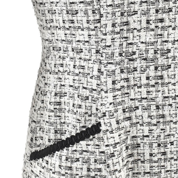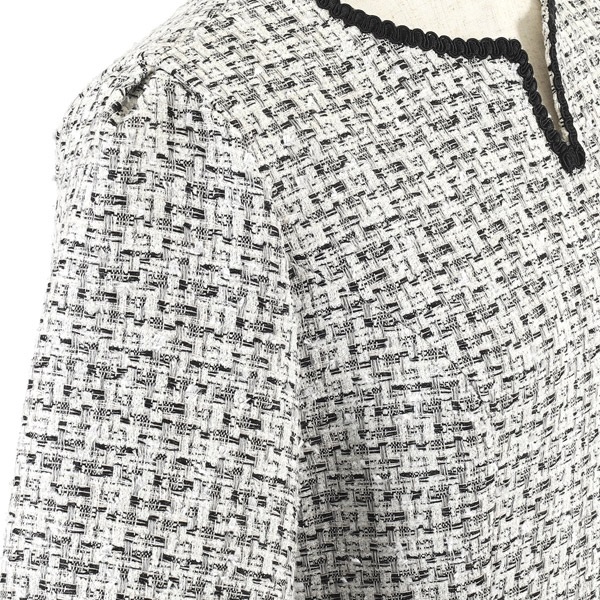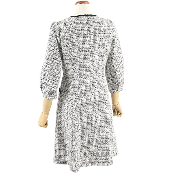 着るだけで華やかさを演出してくれるファンシーツイードの七分丈ワンピース。首元とポケットにあしらったブレードのテープがさり気ないアクセントになっています。首元のカットデザインが抜け感をプラス。袖はボリュームのあるパフスリーブで可愛らしい印象に仕上げました。ややゆったりとしたAラインシルエットですが、スタイルアップして見えるよう、高めのウエスト切り替え位置と、短すぎないミニ丈のバランスにこだわりました。ポケット付きも嬉しいポイント。普段使いはもちろん、オケージョンシーンにもおすすめです。