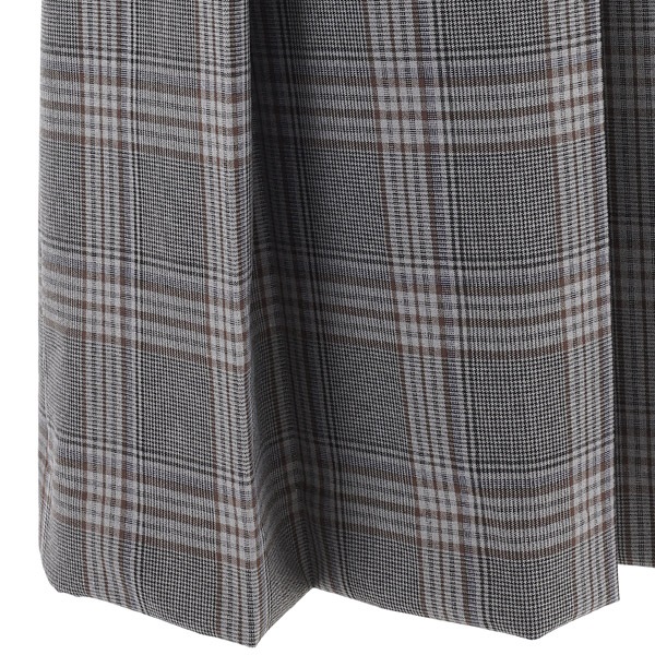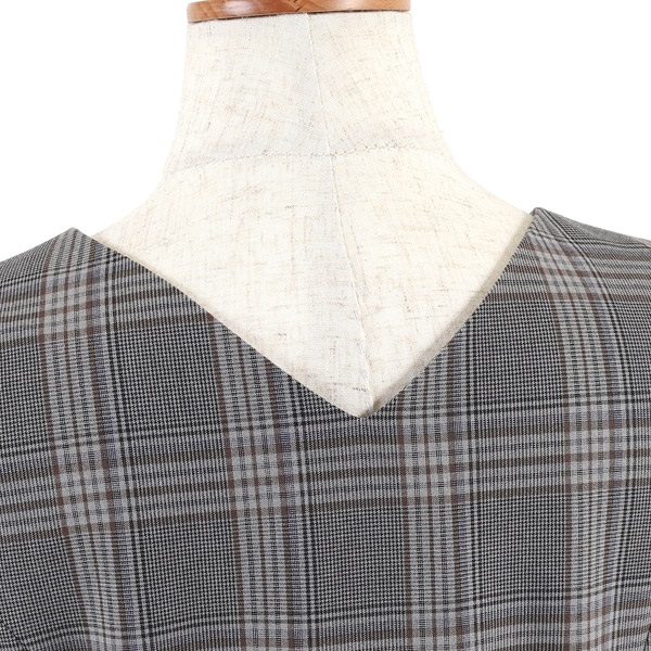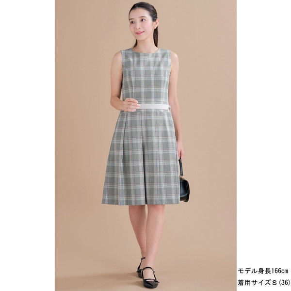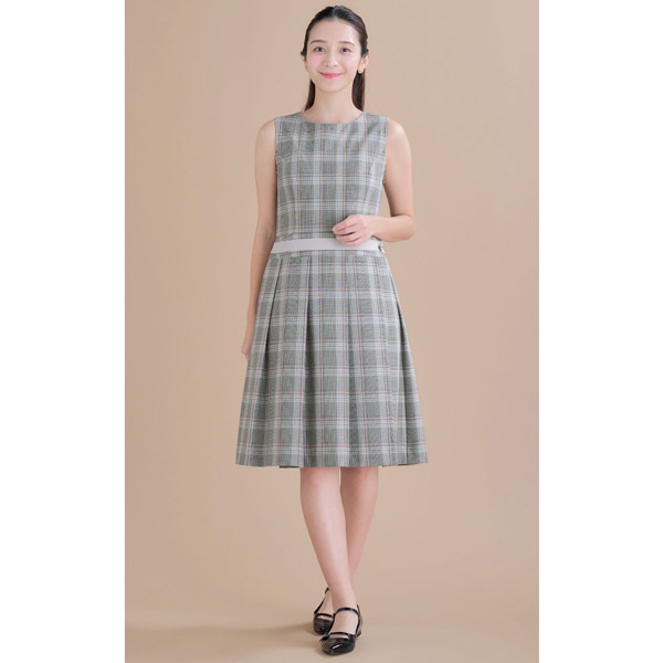 グレンチェック柄のジャンパースカート。プリーツできちんと感をプラスし、トラッドな印象に仕上げました。ウエストベルトの無地の別布がシルエットにメリハリをプラス。Kマークの金具付きボタンがワンポイントです。後ろ側は背中をすっきりと見せてくれるV開きデザインで、バックスタイルにもこだわりました。肌寒い時期にはニットやカーディガンとのレイヤードスタイル、1枚でノースリーブワンピースとしても着用でき、シーズンレスで着回しできるのも嬉しいポイントです。