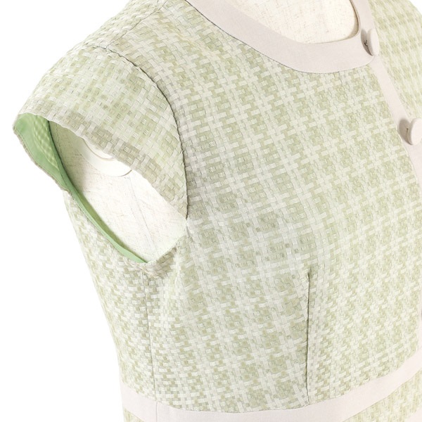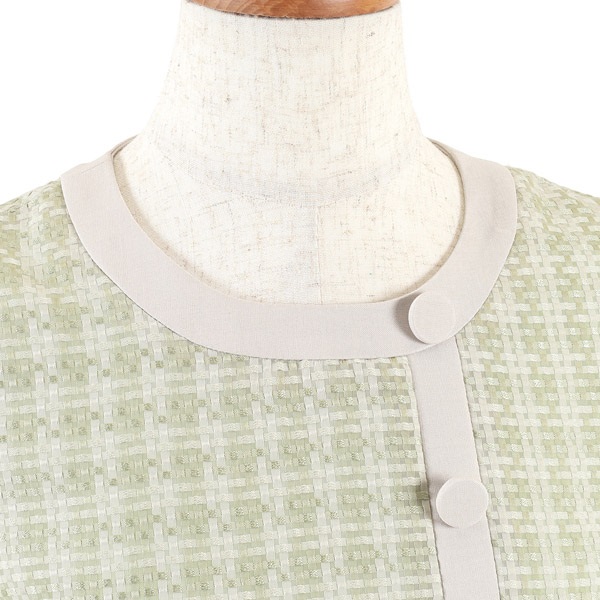 着るだけで華やかさをプラスしてくれる、チェック柄のレース素材を活かしたフレンチスリーブワンピース。首元から胸元、ウエストのラインデザインがアクセントです。前身頃にはくるみボタンあしらい、可愛らしさをプラスしました。スカートは広がりすぎないフレアシルエットで、すっきりとした上品な印象に。膝が隠れる上品な長さで、ヒールでもフラットシューズでもバランス良く見える丈感にこだわりました。ウエスト位置が高めでスタイルアップも叶います。