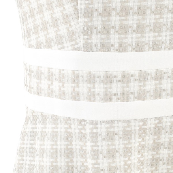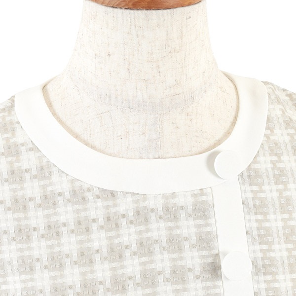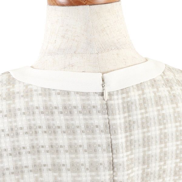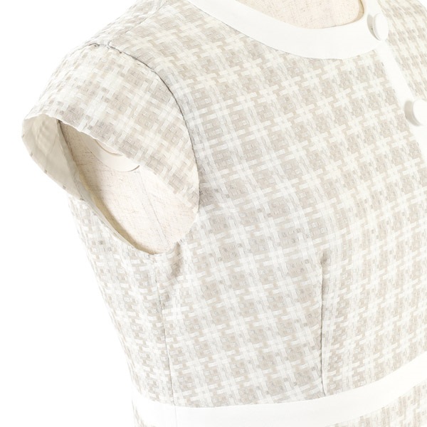 着るだけで華やかさをプラスしてくれる、チェック柄のレース素材を活かしたフレンチスリーブワンピース。首元から胸元、ウエストのラインデザインがアクセントです。前身頃にはくるみボタンあしらい、可愛らしさをプラスしました。スカートは広がりすぎないフレアシルエットで、すっきりとした上品な印象に。膝が隠れる上品な長さで、ヒールでもフラットシューズでもバランス良く見える丈感にこだわりました。ウエスト位置が高めでスタイルアップも叶います。
