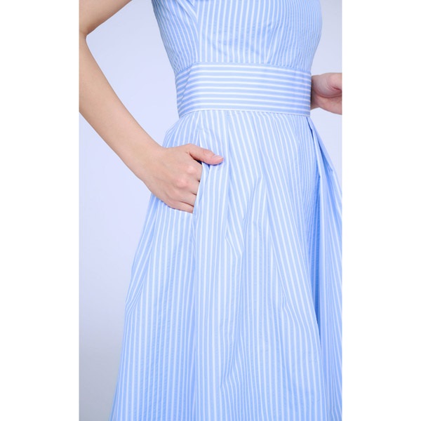 ウエストベルトと首まわり、裾部分の切替がポイントのワンピース。ストライプ生地を活かしたシンプルなデザインに、柄の向きを変えた切り替えでメリハリをプラスしました。袖は肩を自然にカバーできるフレンチスリーブ。スカートにはたっぷりタックを入れ、ボリューム感がありながら、広がりすぎないすっきりとしたシルエットに仕上げました。丈は膝がしっかり隠れる長さで、上品な印象に。高め位置でのウエストマークはスタイルアップ効果も。両サイドにポケットが付いています。