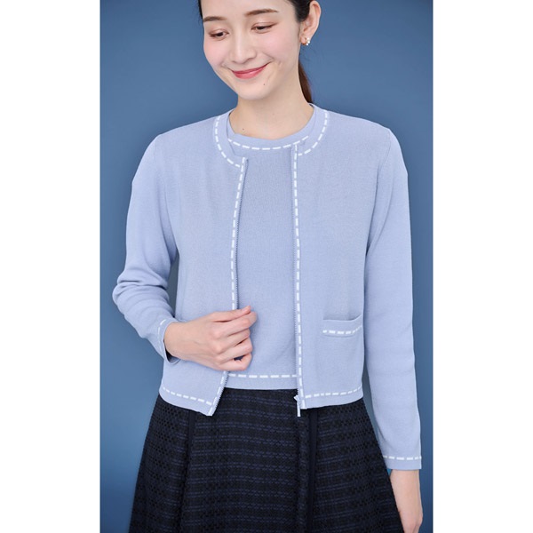 首元や裾、袖口などに施したステッチ風デザインがポイントのニットカーディガン。着回ししやすいシンプルなデザインに、配色のステッチデザインがアクセントになっています。ジップアップデザインで程よいカジュアル感ありながら、上品な印象に仕上げました。ショート丈のコンパクトなシルエットで、羽織としてはもちろん、一枚での着用もおすすめ。配色プルオーバー(KH0841)とのアンサンブルでの着用も可能です。
