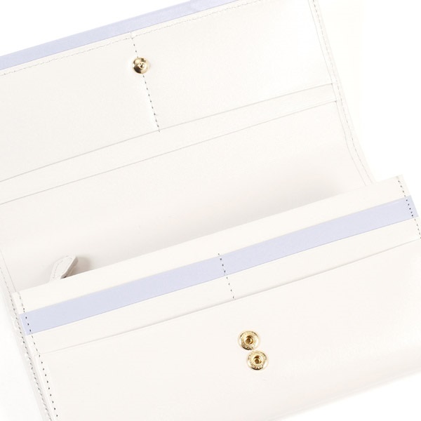 ツヤとハリのある牛革でお作りした長財布。すっきりとしたフォルムが上品な印象です。「KITAMURA MOTOMACHI」の文字に囲まれたKマークの飾りがポイント。かぶせの下と、カード段の一部にアクセントカラーをプラスしました。カード段やポケットなど収納スペースが充実しており、小銭入れは大きく開くL字タイプです。