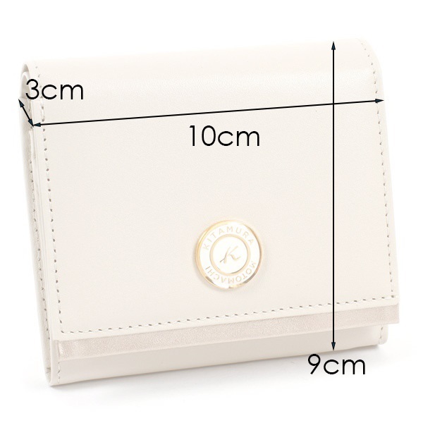 ツヤとハリのある牛革でお作りした二折財布。「KITAMURA MOTOMACHI」の文字に囲まれたKマークの飾りがポイントです。かぶせの下と、カード段の一部にアクセントカラーをプラスしました。手のひらに収まるスリムなデザインで、札入れに1万円札がぴったり入るサイズ感です。