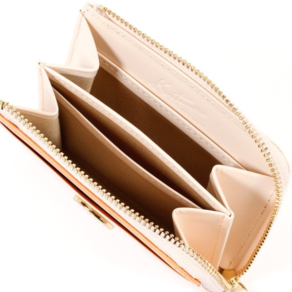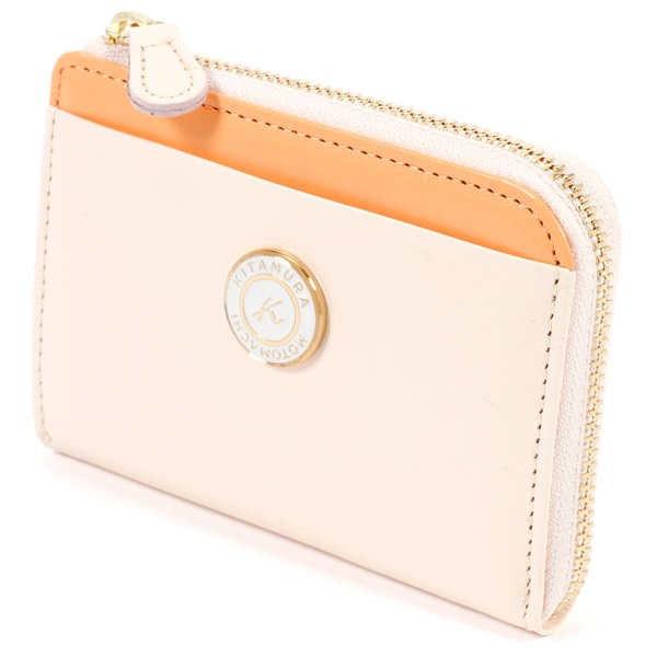 ツヤとハリのある牛革でお作りした小銭入れ。表面の一部にアクセントカラーをプラスしました。L字ファスナーのすっきりとしたフォルムが上品な印象です。「KITAMURA MOTOMACHI」の文字に囲まれたKマークの飾りがポイント。カードも収納でき、コンパクトなお財布としてもおすすめです。