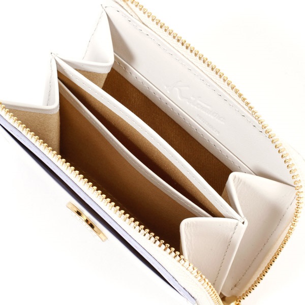 ツヤとハリのある牛革でお作りした小銭入れ。表面の一部にアクセントカラーをプラスしました。L字ファスナーのすっきりとしたフォルムが上品な印象です。「KITAMURA MOTOMACHI」の文字に囲まれたKマークの飾りがポイント。カードも収納でき、コンパクトなお財布としてもおすすめです。