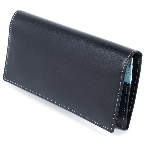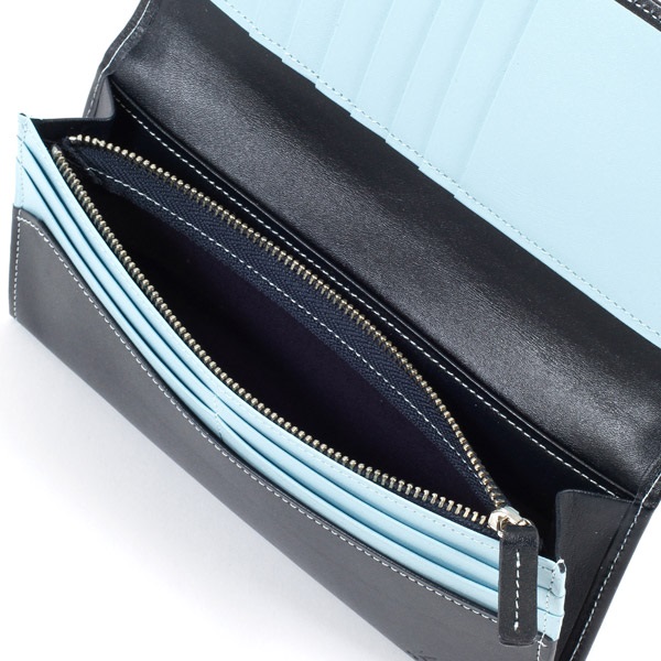 ツヤのあるスムース牛革でお作りした、シンプルなかぶせ型長財布。手触りが良く、しっとりとした質感が特徴です。カード段の遊び心ある配色がさりげないオシャレ感をプラス。薄マチながら収納スペースが充実し、カードもたくさん入ります。レシートやチケットを入れられるポケットも便利です。