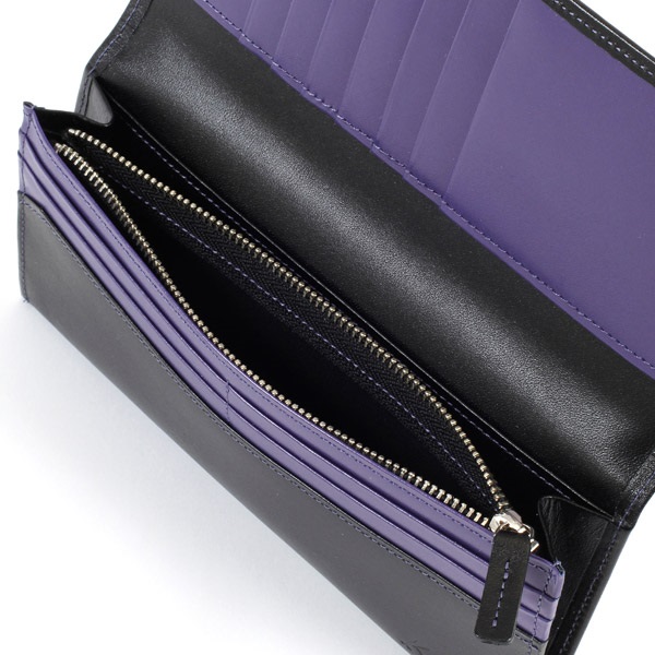 ツヤのあるスムース牛革でお作りした、シンプルなかぶせ型長財布。手触りが良く、しっとりとした質感が特徴です。カード段の遊び心ある配色がさりげないオシャレ感をプラス。薄マチながら収納スペースが充実し、カードもたくさん入ります。レシートやチケットを入れられるポケットも便利です。