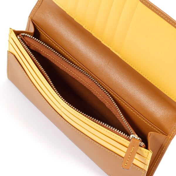 ツヤのあるスムース牛革でお作りした、シンプルなかぶせ型長財布。手触りが良く、しっとりとした質感が特徴です。カード段の遊び心ある配色がさりげないオシャレ感をプラス。薄マチながら収納スペースが充実し、カードもたくさん入ります。レシートやチケットを入れられるポケットも便利です。