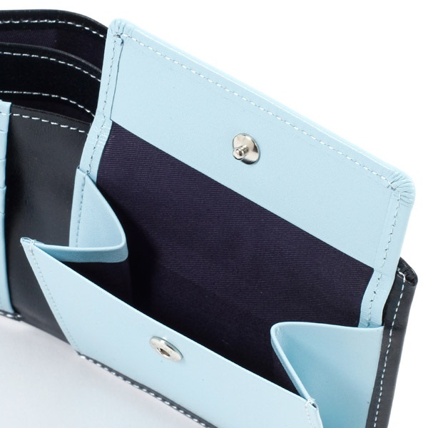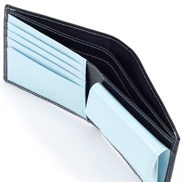 ツヤのあるスムース牛革でお作りした、シンプルな二折財布。手触りが良く、しっとりとした質感が特徴です。カード段と小銭入れの遊び心ある配色がさりげないオシャレ感をプラス。小銭入れは使いやすいかぶせタイプです。