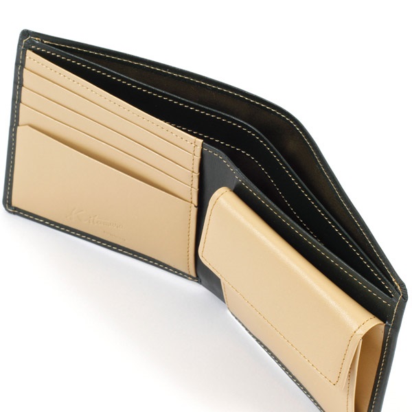 ツヤのあるスムース牛革でお作りした、シンプルな二折財布。手触りが良く、しっとりとした質感が特徴です。カード段と小銭入れの遊び心ある配色がさりげないオシャレ感をプラス。小銭入れは使いやすいかぶせタイプです。