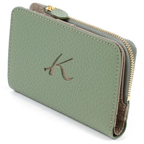 Kマークの抜き型が印象的な二折財布。シボ感が特徴のソフトなシュリンク牛革を使用しており、優しい手触りと、キズが目立ちにくいのがポイントです。カード段以外にも内ポケットが2つ付いていて収納力も充実。L字ファスナーの小銭入れは、見た目も軽やかですっきりとした印象に仕上げました。