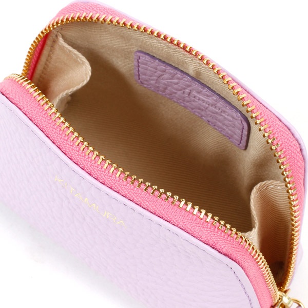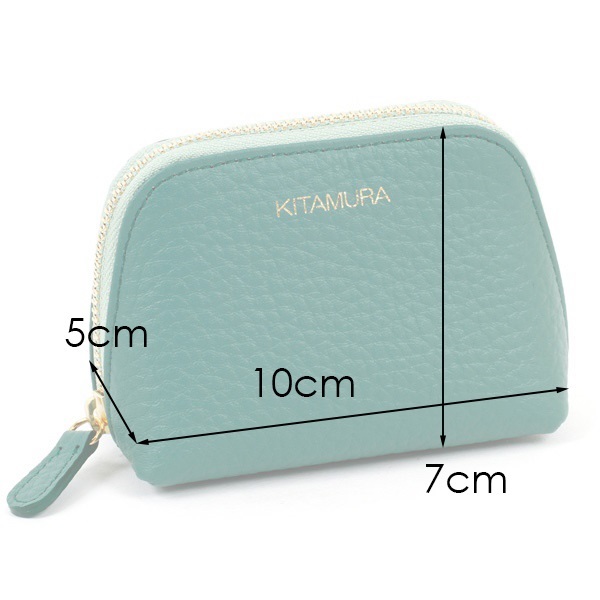 本体とファスナーテープのカラーコンビがポイントの牛革ポーチ。カラーコンビが映えるシンプルなデザインで、前面には箔押しのKITAMURAロゴをあしらいました。コスメやイヤホンなど、細かいものの収納におすすめの小ぶりなサイズ感です。