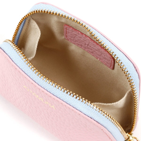 本体とファスナーテープのカラーコンビがポイントの牛革ポーチ。カラーコンビが映えるシンプルなデザインで、前面には箔押しのKITAMURAロゴをあしらいました。コスメやイヤホンなど、細かいものの収納におすすめの小ぶりなサイズ感です。