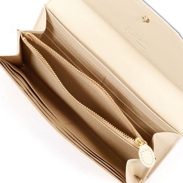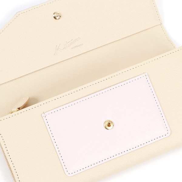3色のマルチカラーがポイントの長財布。かぶせに箔押しのKITAMURAロゴをあしらいました。シンプルな内装ですが、カード段も充実。前側には定期券など使用頻度の高いカードを入れるのに便利なカードポケット付き。型押しの牛革を使用しているので、キズが目立ちにくいのも嬉しいポイントです。