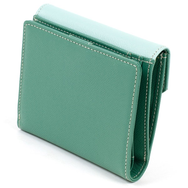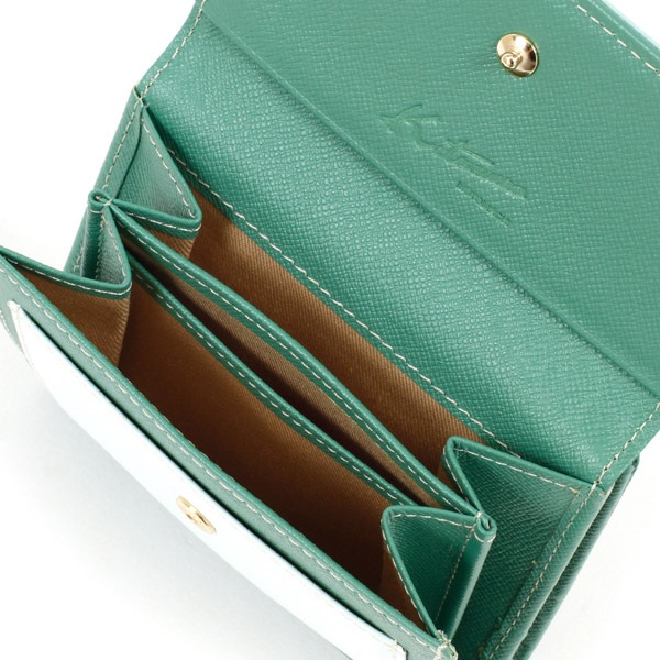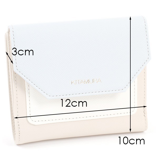 3色のマルチカラーがポイントの二折財布。かぶせに箔押しのKITAMURAロゴをあしらいました。マチがスリムで持ち歩きしやすいコンパクトなつくりです。小銭入れ部分には定期券など使用頻度の高いカードを入れるのに便利なカードポケット付き。素材にはキズが目立ちにくい型押しの牛革を使用しています。